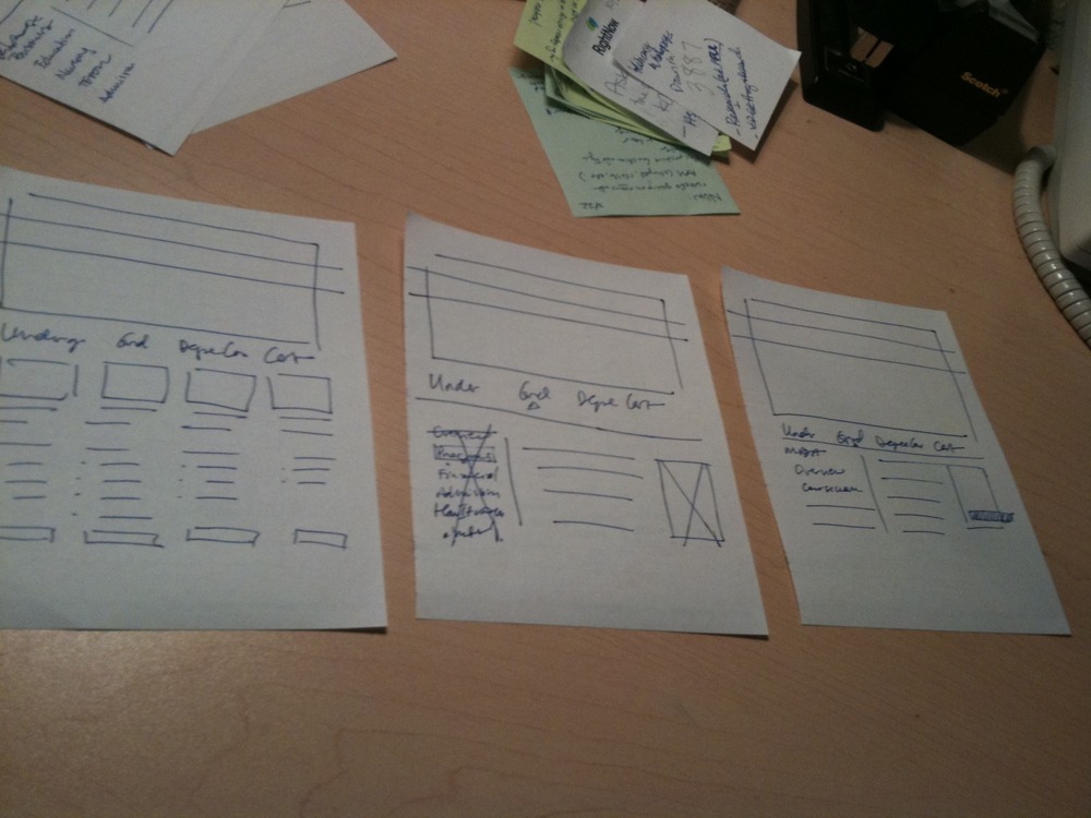 I love using these little recycled note pads our office makes out of 8 1/2″ x 11″ used printer paper. The quarter sized version is just perfect for making little wireframe sketches. In this instance, I was trying to problem solve an architecture problem that had cropped up.